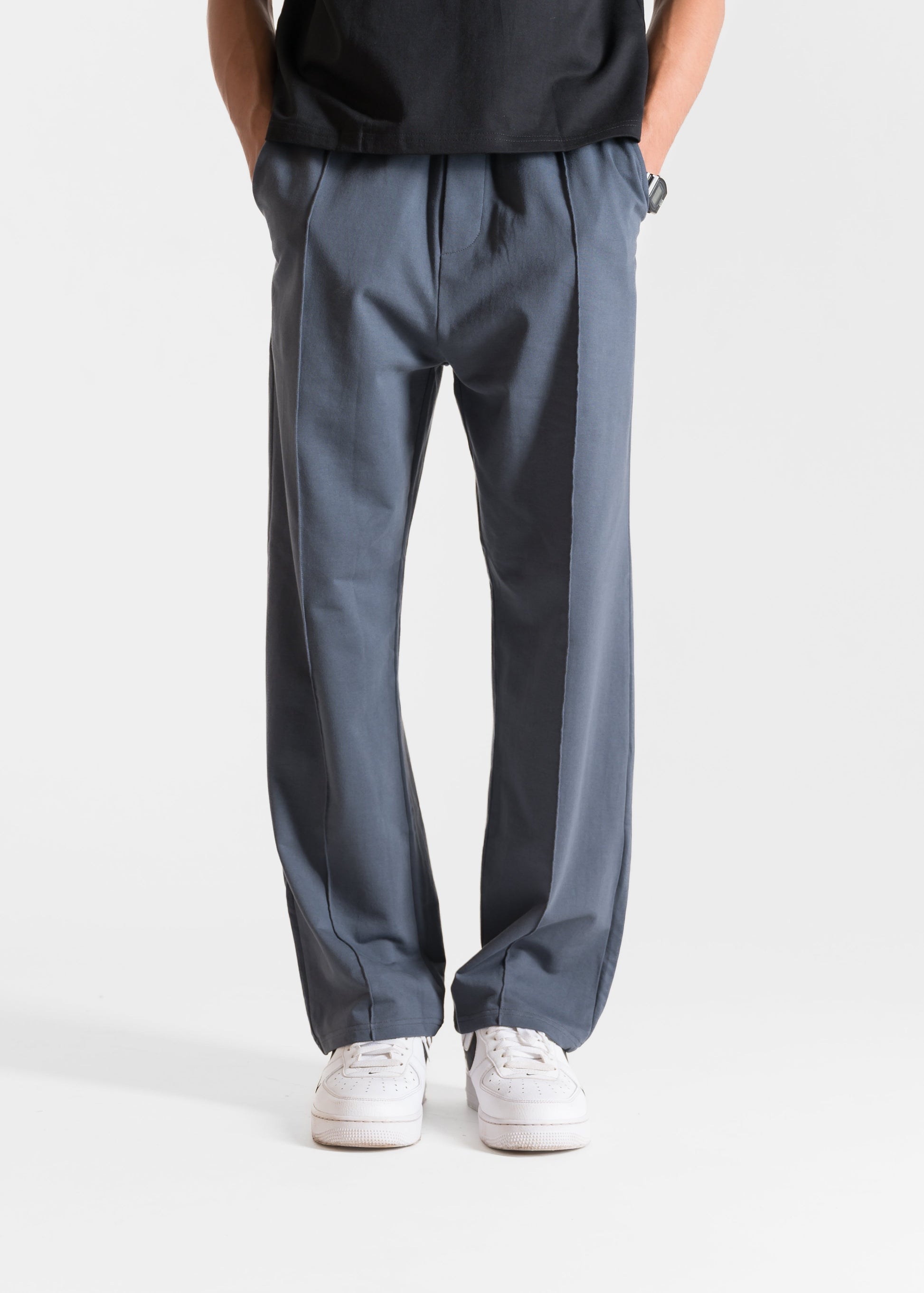 These straight-fit lounge pants, made from breathable cotton fabric, have an elasticated waistband, pockets, and a classic relaxed silhouette. They're comfortable and stylish for lounging, errands, or casual outings.