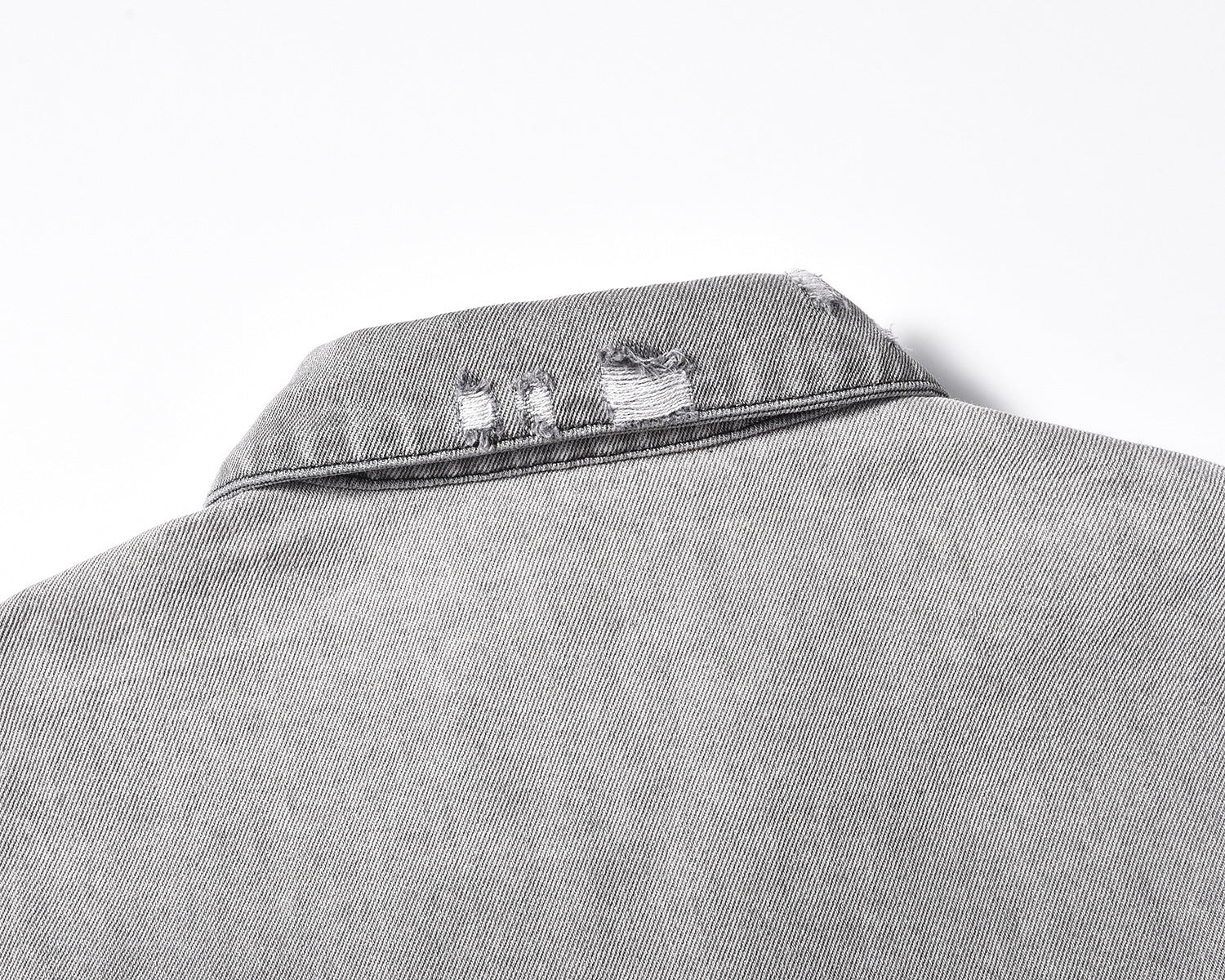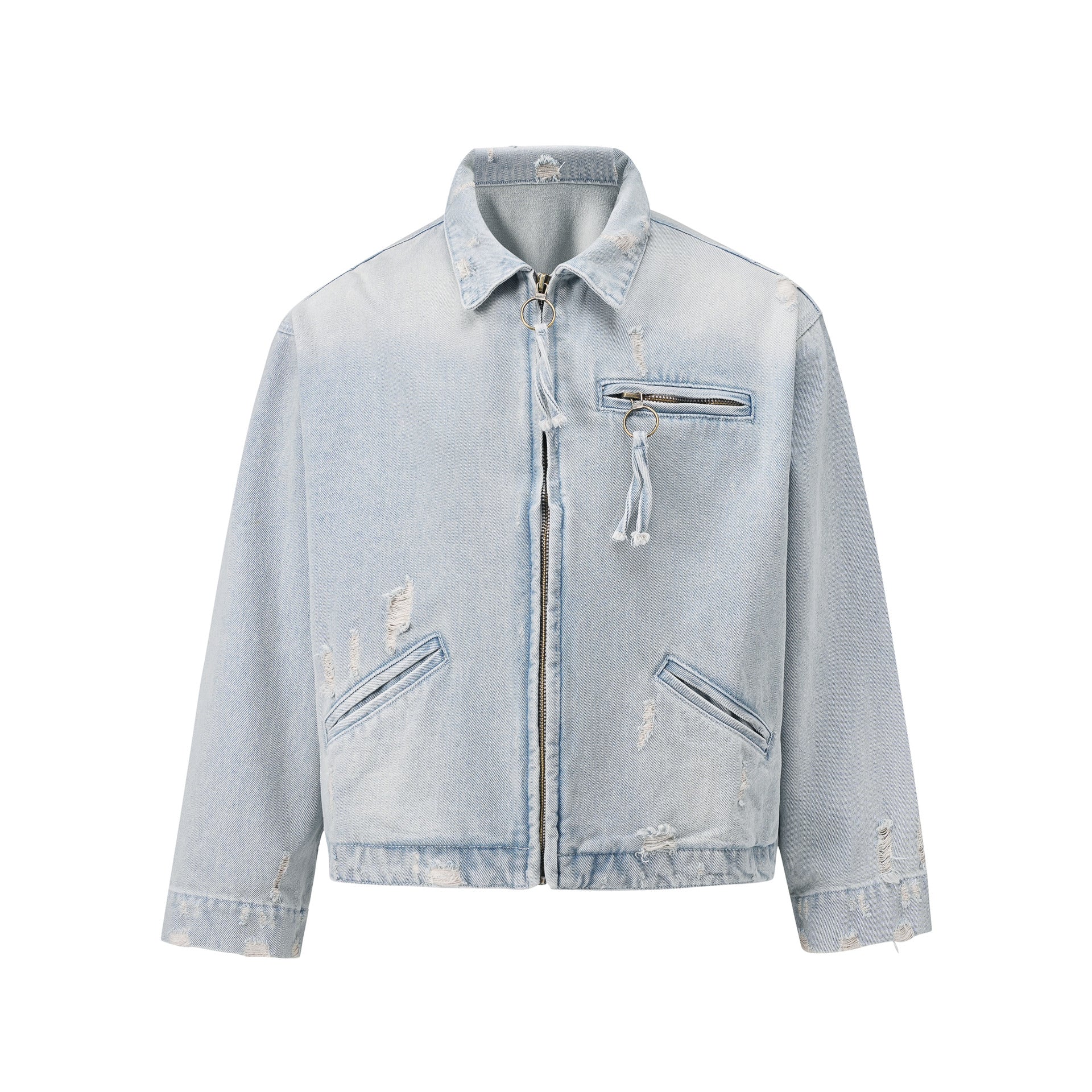 Add an edge to your wardrobe with this light blue distressed denim jacket. Featuring a relaxed fit and bold zipper details, it’s the perfect statement piece for casual, streetwear-inspired looks.