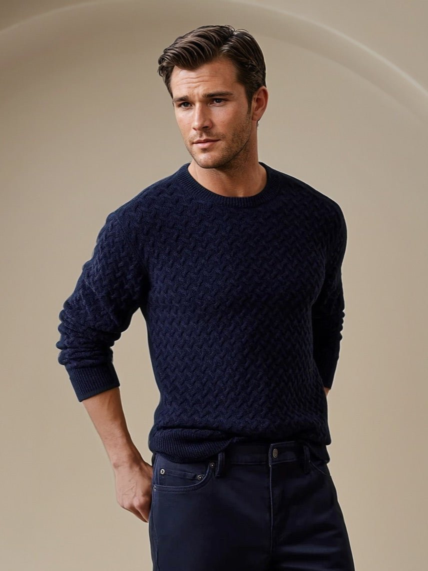 This navy blue sweater is a refined and versatile piece perfect for cooler seasons. Its intricate knit design adds sophistication, making it suitable for both casual and semi-formal settings.
