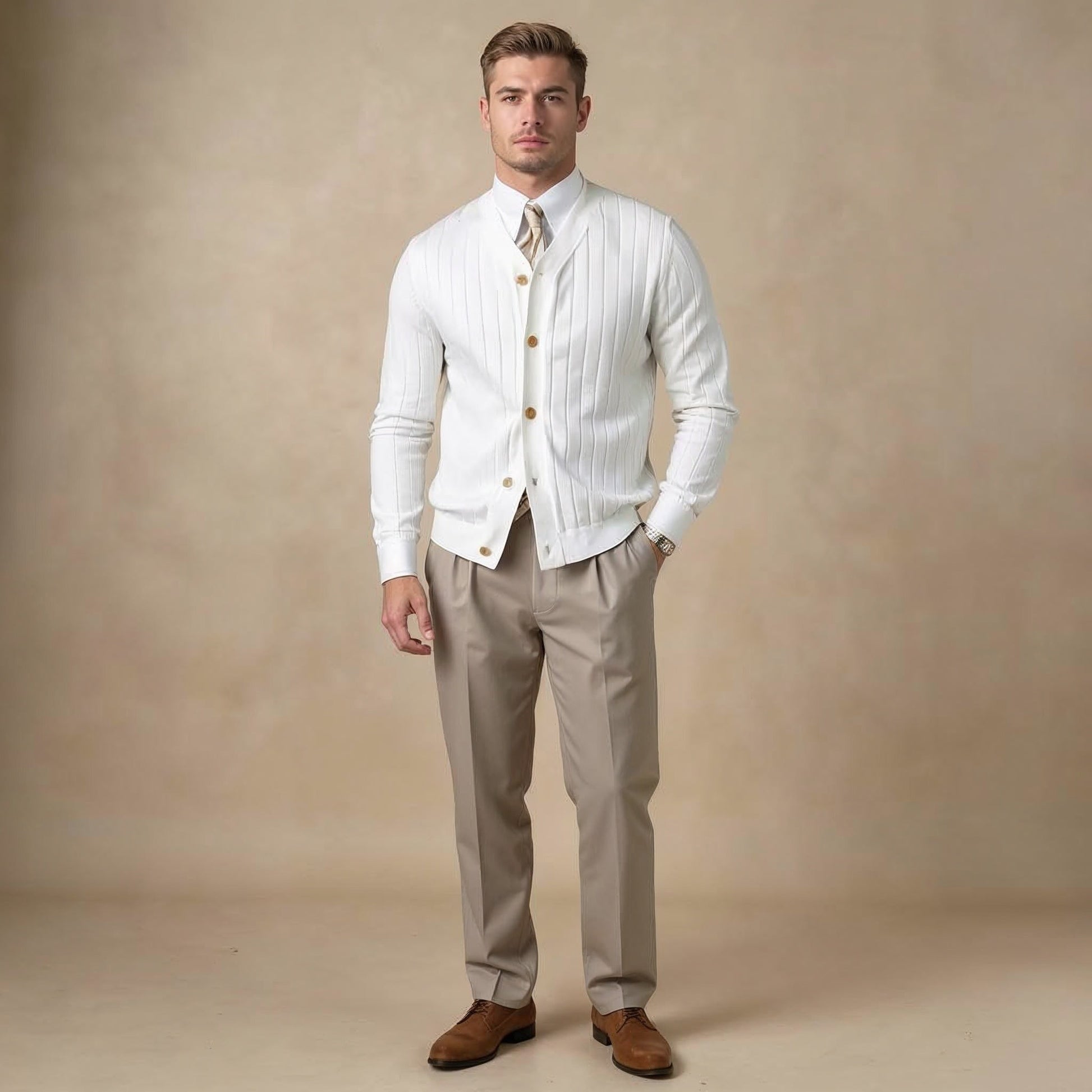 Crafted from a soft and lightweight knit, the RAPHAELO VINIA embodies refined summer elegance with a contemporary Italian spirit. Its streamlined silhouette features a tailored fit, subtly structured shoulders, and a deep V-neckline framed by a contrasting button placket. The vertical striped motif enhances the garment’s sleek aesthetic, highlighting its exclusive and timeless character.